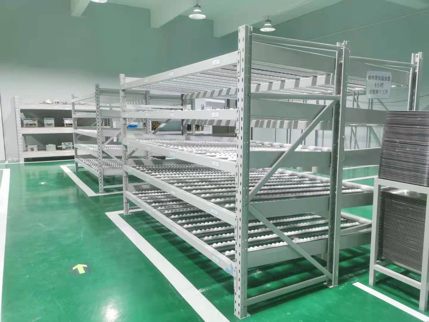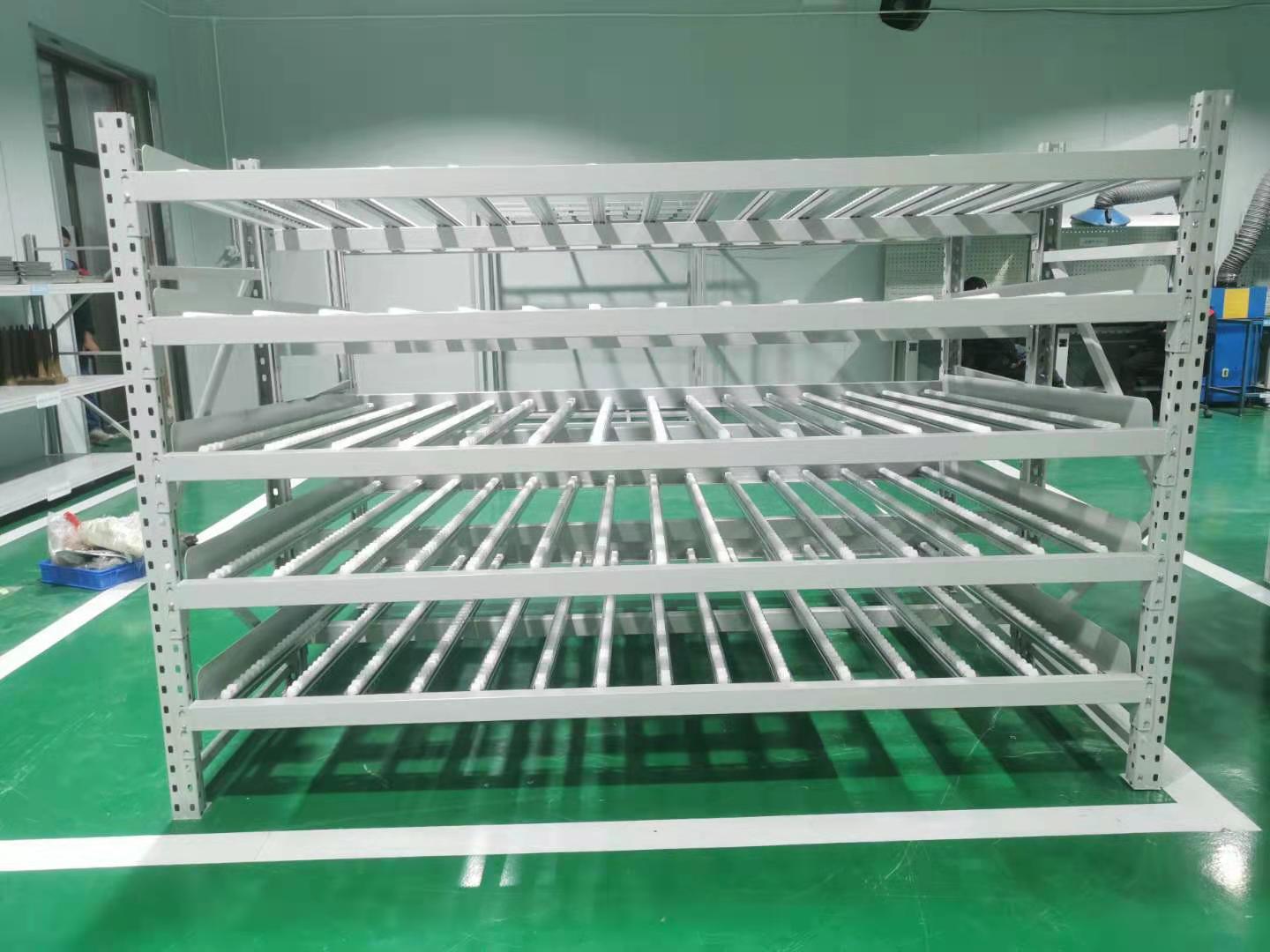 定制倉(cāng)儲(chǔ)貨架除了單純的存儲(chǔ)貨物以外,很多企業(yè)還會(huì)有別的需求,比如倉(cāng)儲(chǔ)貨架如何保證先進(jìn)先出,讓貨物揀選更方便等。下面一起來(lái)看看流利式貨架鋁合金怎樣保證貨物實(shí)現(xiàn)先進(jìn)先出的。下圖是我司為深圳一家大型電子廠定做的流利式貨架: