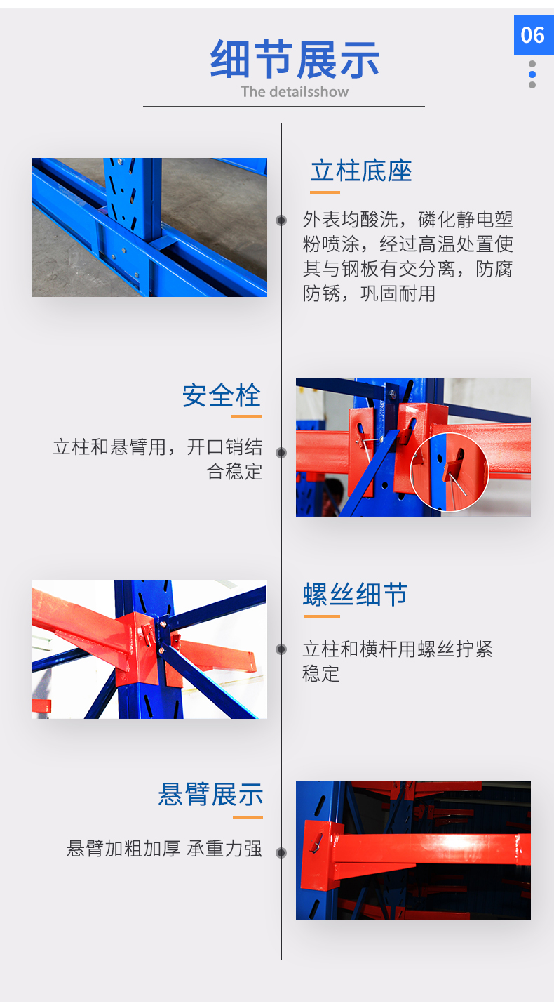 懸臂式貨架是貨架中重要的一種。適用于存放長物料、環型物料、板材、管材及不規則貨物。可以是單面或雙面,懸臂式貨架具有結構穩定,載重能力好、空間利用率高等特點。懸臂式貨架立柱多采用H型鋼或冷軋型鋼,采用方管、冷軋型鋼或H型鋼,懸臂與立柱間采用插接式或螺栓連接式,底座與立柱間采用螺栓連接式,底座采用冷軋型鋼或H型鋼。